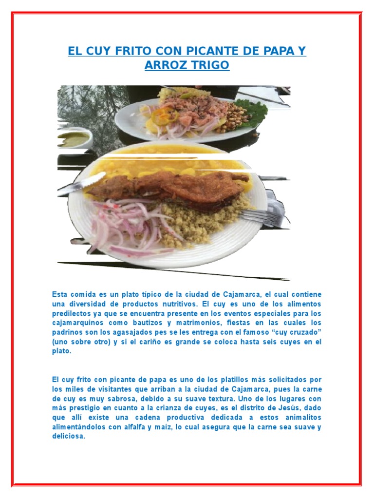 La crocante y generosa presa se sirve con un guiso de papa aderezado con ají panca maní pimienta y sal. Sazone el cuy con sal. 20 nov 2015 aprende cómo preparar cuy frito de cajamarca acompañado de papa picante paso a paso con esta receta ingredientes y procedimiento mira.